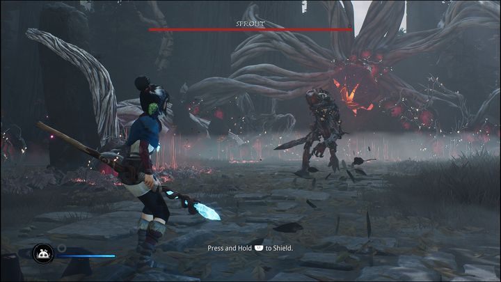 Sprout is the first powerful opponent that will stand in your way. A short cut-scene will play before the fight. Then, the fight will begin. At the start, you will receive a tip that instructs you to use your shield against Sprout's attack.