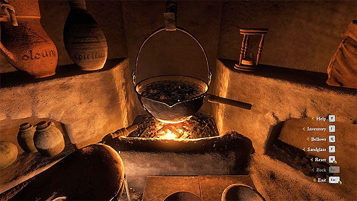 Step 1 - Approach the alchemy bench. Check the book on the right and find Merhojed Remedy (see the picture). The ingredients are 1 Valerian, 2 Thistle and 1 Charcoal. Hold the interaction button to move all the required items from the inventory to the alchemy bench.