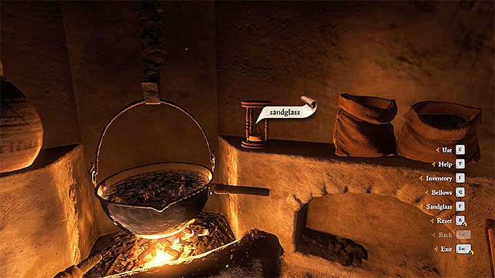 Step 7 - Use the bellows again until you notice bubbles on the water's surface. Interact with the sandglass and rotate it. Wait for the sand to go down into the bottom part (this time you have to do that only once).