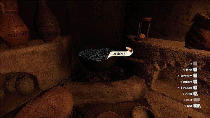 Step 10 - Find a bottle on the left and pick it up. Use it on the cauldron to pour its content into the bottle.