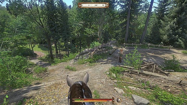 Stick to the main path that goes south. Another place where you can ask about Pie is the small camp in the forest presented in the picture. Speak with the traveler. You learn that you should look for the horse around the stream located south-east from this camp. Reach the river and follow it east.