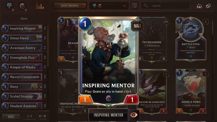 - High priority - Inspiring Mentor, Omen Hawk, Navori Conspirator and/or Scaled Snapper. Your goal is to put pressure on your opponent from round 1 onwards and strengthen the units in your hand/deck.