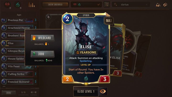 - Level Up - Elise advances to higher level when you have at least 3 spiders at the beginning of the round. After advancing to a higher level, Elise gains additional statistics, a Challenger keyword, and adds the Fearsome and Challenger keywords to all spiders.