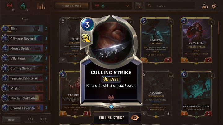 - Culling Strike - a spell that instantly eliminates a unit that has 3 or less attack points. Culling Strike is a Fast spell, so the opponent can respond to it by using Deny or by strengthening the unit beyond the required number of points. By using the Culling Strike, you can instantly eliminate uncomfortable Champions like - Braum, Zed, Elise, Draven, Fiora.