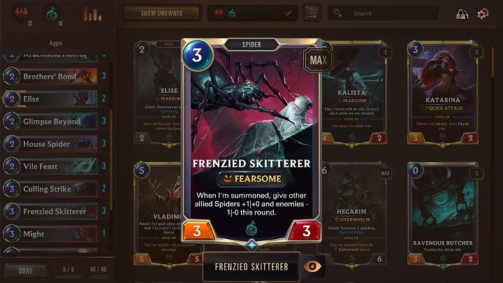 (2)Elise x2 (6)Darius x2 (1)Hecarim x1 | (1)Elixir of Wrath x1 (1)Legion Rearguard x3 (1)Precious Pet x3 (2)Brothers' Bond x3 (2)House Spider x3 (3)Culling Strike x2 (3)Might x1 (3)Noxian Guillotine x1 (4)Crowd Favorite x3 | (1)Hapless Aristocrat x3 (2)Arachnoid Horror x3 (2)Glimpse Beyond x3 (3)Vile Feast x3 (3)Frenzied Skitterer x3 |