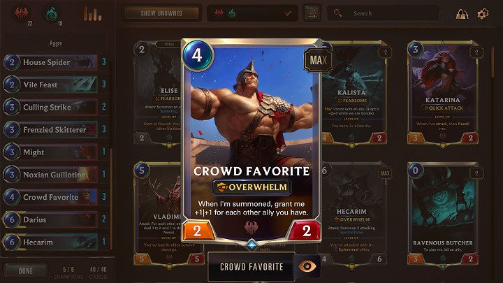 - Overwhelm - A keyword that causes excessive damage to be transferred directly to enemy Nexus. There are several such units in this deck: Crowd Favorite, Darius, Hecarim.