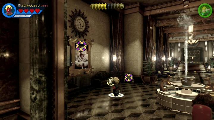 The next Minikit is in the hall, inside the fountain. Approach the painting on the left, and use Doctor Strange to move it. Destroy the golden wall behind the painting, and use the scattered pieces to build an amplifier. Select Star-Lord, and throw a gravity mine at the amplifier. This will destroy the fountain and reveal Minikit #5.