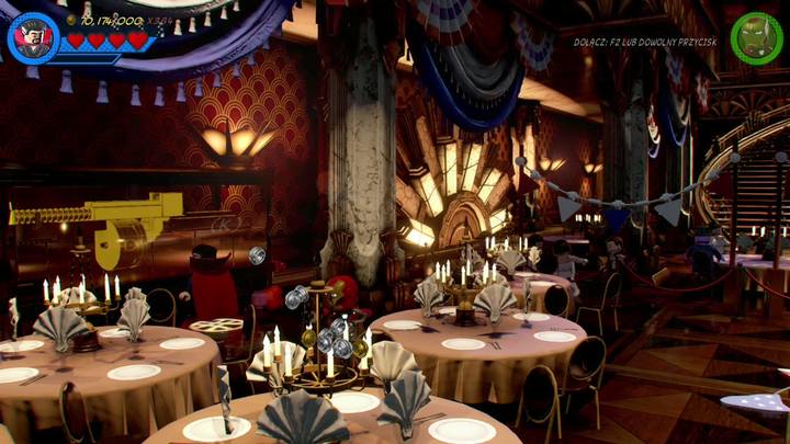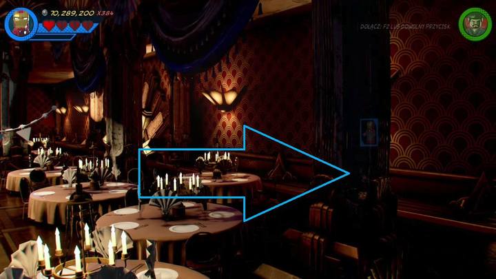 Another Minikit is in the banquet area where you battle the main villain - Kingpin. Your task will be to destroy five pink cakes. Two of them were marked for you in the screenshot, while the remaining three are on the right side of the room.