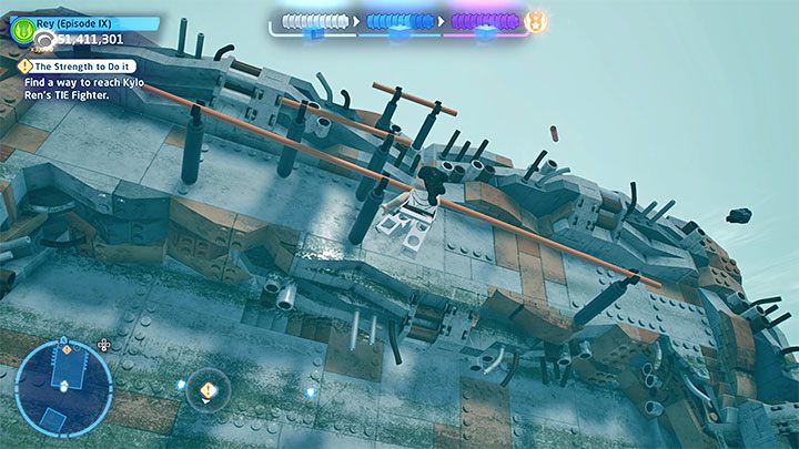 - Switch to Rey again and jump across the protruding elements to reach the safe platform visible in the distance.