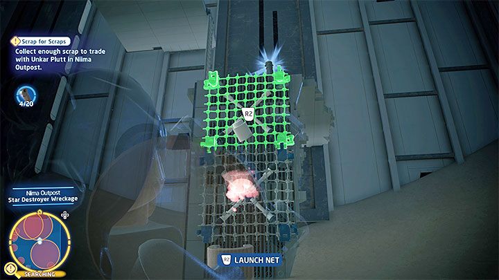 The first gadget you create will be the Net Launcher. You can use it on walls with X-shaped hooks. After setting up the net on a vertical wall like this one, Rey will be able to climb up. It is worth noting that you can place several nets next to each other - you have to do that to reach the top shelves.