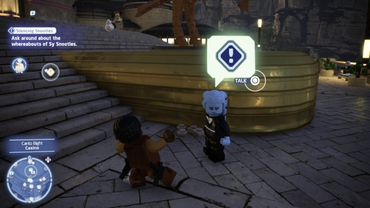 Talk to the man by the stairs and then enter the casino. Follow the marker to the search area and talk to the casino employee. He will tell you that Snootles has flown to Coruscant.