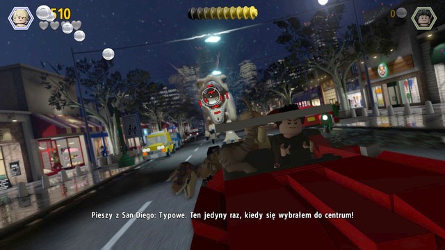 You will receive minikit number eighth during the chase on the streets of San Diego. To get it, you must switch your character to the one that isn't driving the car and throw the flares at the tyrannosaurus. After hitting him three times you will receive the minikit.