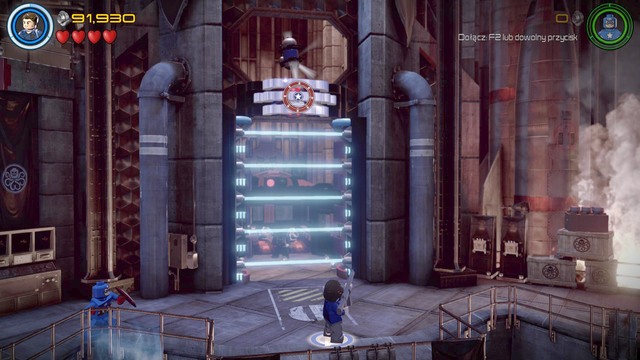 Once you reach higher floor, aim as Barnes at the upper silver cover shown on the picture. Switch your character to Captain America once it is done and throw the shield at the previously uncovered object. After unlocking the laser gate your task will be getting to the elevator. But first you must defeat the enemy that is protecting it. In order to do it you must switch character to Captain America and use the shield to protect yourself from enemy's laser attack. Start walking towards the enemy covered behind the shield until you are close enough to destroy the opponent.
