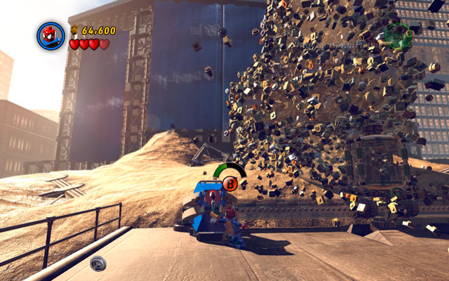 Turn away and go to the central part of the arena. Find a pile of sand on the left and destroy it with Hulk's smash attack (simply press jump and attack buttons). Build concrete mixer from the debris and throw it at the enemy. When giant falls, hit him as before.
