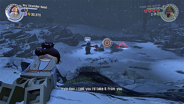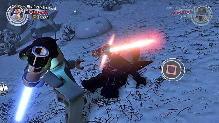 Switch to Rey, who has not participated in the battle. Deal with stormtroopers and head towards the spot with interactive bricks. Use them to build a cannon that will lay fire on Kylo Ren and have him stop using the Force.