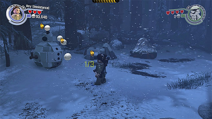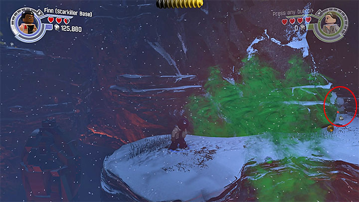 The snowball rolls to the left and, at the same time, grow larger. Go there and do not worry, if you inadvertently start the fight with Kylo Ren, because you do not have to go there. Start pushing off the snowball to obtain the red brick in mid-air.