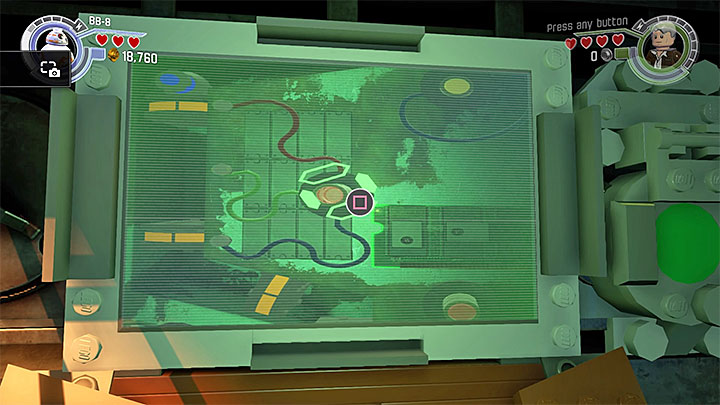Switch back to BB-8 and drive the robot through a small hole. In the new area place BB-8 next to the socked and start a new mini-game. The aim of the mini-game is to bring the blue fuse to the bottom of the labyrinth. At the beginning you need to press the buttons shown on the screen. The only exception is a situation shown on the above screenshot, where you must press the same button a few times.