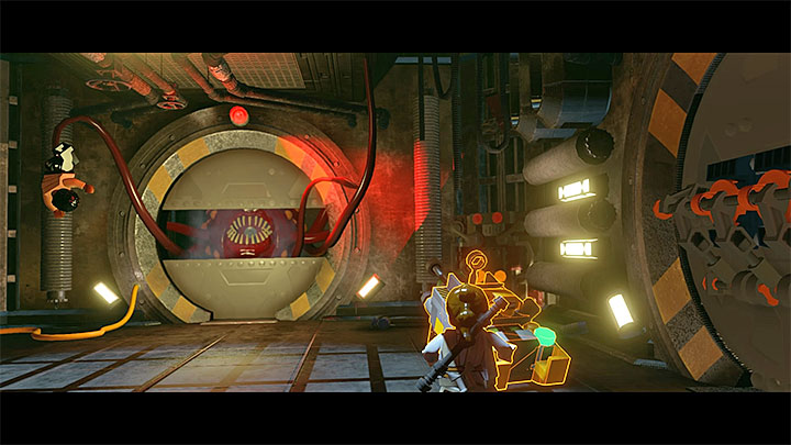 After arriving at the closed barrier, switch to BB-8, attach the robot to the socket and lift the barrier. The next area is filled with toxic gas. Switch to Finn and use his grappling hook to attach him to the upper handle.