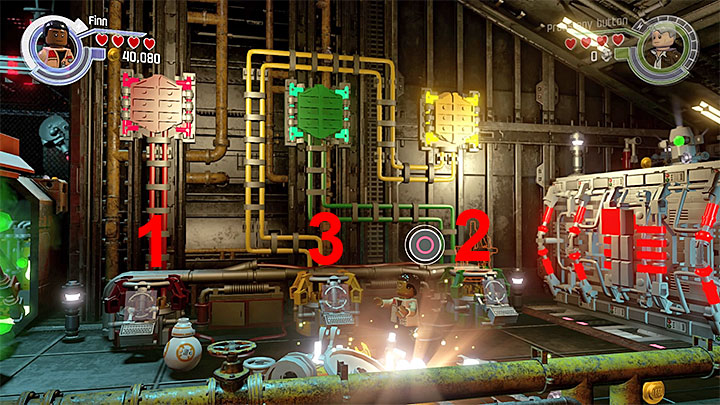 Select Finn and go through the corridor on the left side, filled with toxic gas. Reach the valve and turn the gas off. You can now switch to Rey, go through the now-safe corridor and approach the platform that will catapult her to the right side.