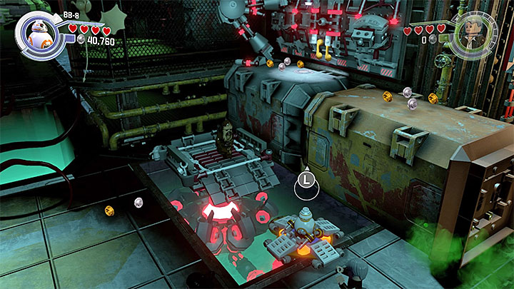 Head to the left side of the hangar and interact with the bouncing blocks located there to construct a launcher. Switch to BB-8, place the robot into the launcher and catapult it to reach the upper ledge.
