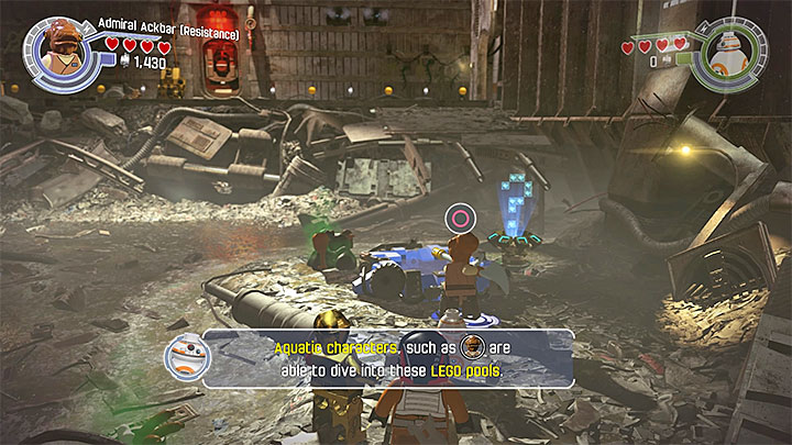 The room will now shrink, but your characters aren't in any danger. Switch to Admiral Ackbar, grab onto the upper handle and pull it out of the wall. Afterwards, new interactive blocks will appear in the area - use them to construct a large object on the left side of the room. Activate the device you've just constructed with BB-8 and you will flush out a new monster hidden in the nearby water reservoir.