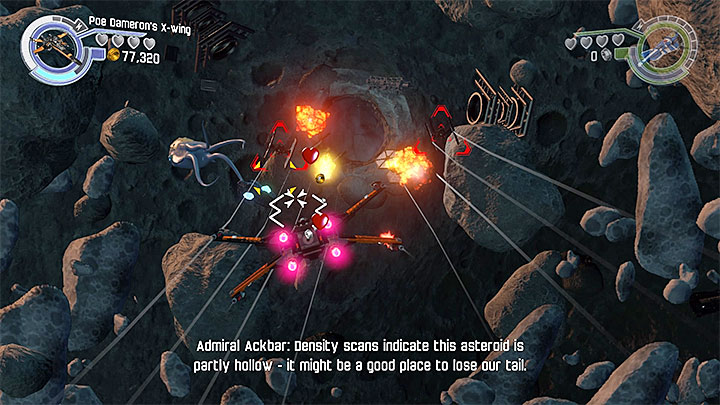 In the next phase of the mission you will be controlling Poe Dameron's X-Wing. The phase starts from a linear section, during which you should try to shoot down enemy TIE Fighters flying in the area. The next part is a flight through one of the asteroids - during this section you should focus on avoiding red crosshairs of the enemy fighters, preventing you from receiving damage from their attacks.