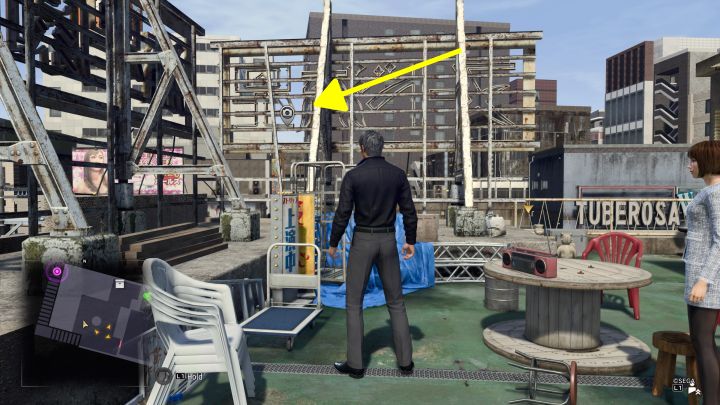 Return to Kasuga's apartment on Romance St., which is the hideout for Yokohama. On the balcony outside the apartment, approach the rear structure consisting of 2 large neon signs. We show the exact shot you need to take on the screenshot above.