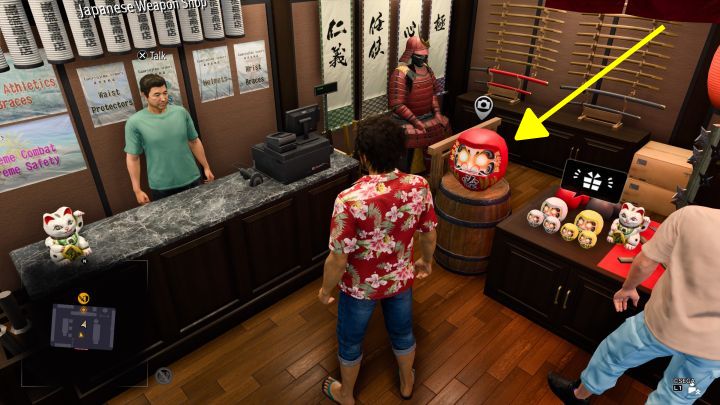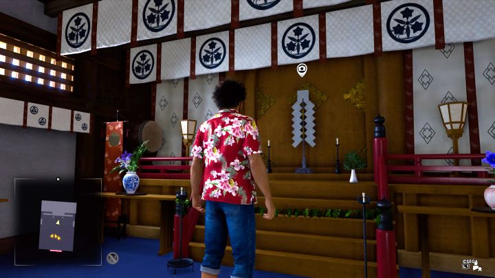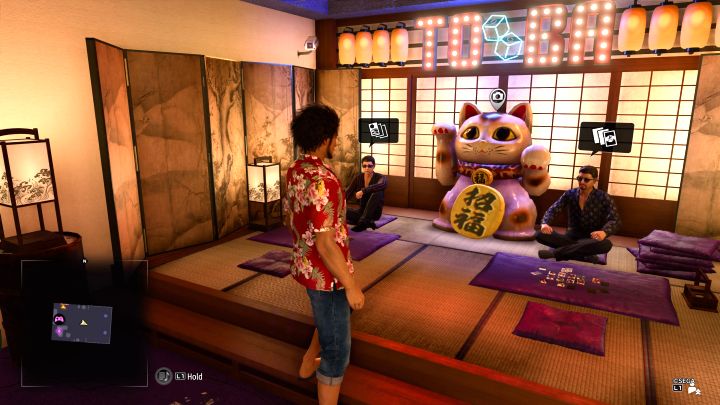The best approach would be to return to this location in the later phases of the game, as by then Ichiban should have all of his statistics developed to level 8. Once inside, photograph the large cat statue between two players.