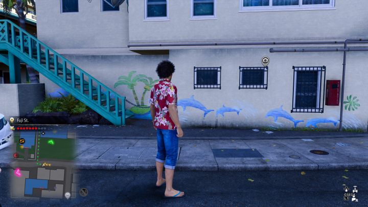 You need to photograph a mural depicting blue dolphins against a white wall of the building. The sought mural is found on Fuji St., south-east from the Shrine.