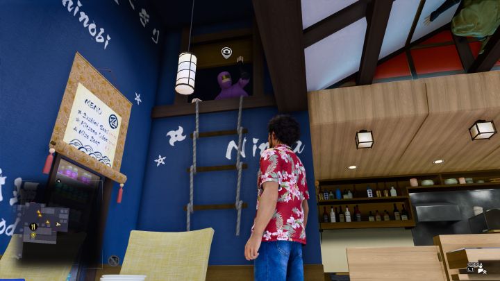 First, you need to find the mentioned sushi place - it is on Sakura St., near the Shrine. Enter the restaurant and start looking around the ceiling. Your objective is to photograph the upper body of the purple ninja warrior.