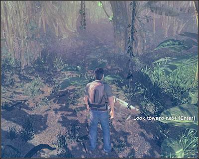 Thankfully, you shouldn't have any problems navigating through the jungle. You will have to approach some of the fragments of the plane. The first fragment can be found near Locke (screen). Don't click on the right object, because you don't want to go back to the beach. Instead, examine the left fragment. The game will switch to a FPP view in order to show you where to find the next metallic object. Exit the FPP view and start running there. Once you've arrived, hide inside the trees in order to avoid the black smoke. You'll also find some papayas along the way. You can pick them up if you want to, however try staying near the main path.