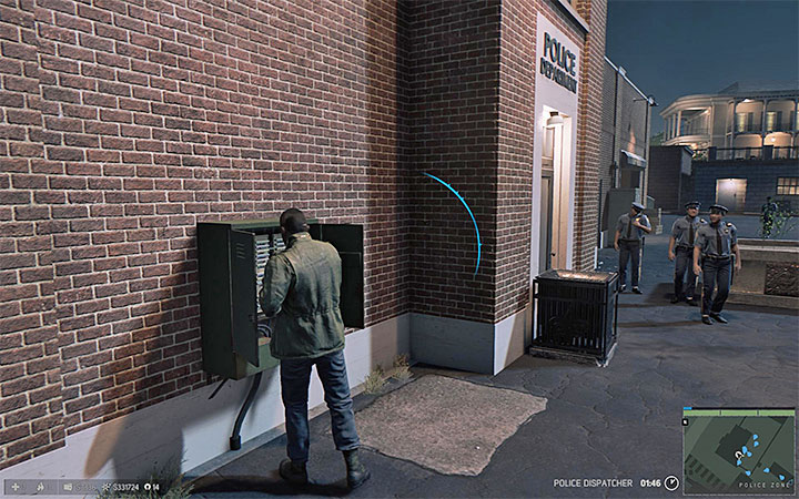 Note - before you take to weakening the racket, it is a good idea to bug all of the fuse boxes in Southdowns. While doing that, take all precautions, because some of the boxes are in forbidden zones. In the case of districts that are being guarded by gangsters, all you have to do is eliminate them, sneak past them or distract them. It is much more difficult to bug the box shown in the above screenshot, because it is at the police precinct and Lincoln could be attacked at the first attempt to come close. The easiest way around the problem is contacting the Police Dispatcher, but to ensure yourself with "immunity" for the duration of 2 minutes, you will have to sacrifice one marker. Alternatively, you can eliminate the 3-4 nearby police officers and, in order to avoid being spotted and avoid the arrival of reinforcements, you will have to use a suppressed weapon.