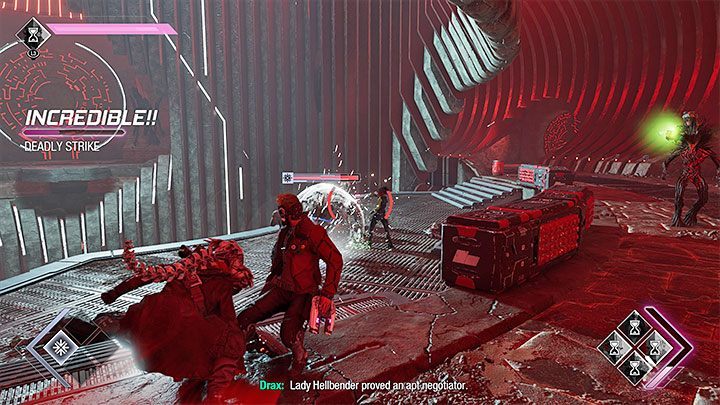 Run to one of them and press the indicated button to order Drax to throw the bomb. Make sure that no one interferes. Otherwise, the attack may end prematurely. The bomb will deal the boss some damage.
