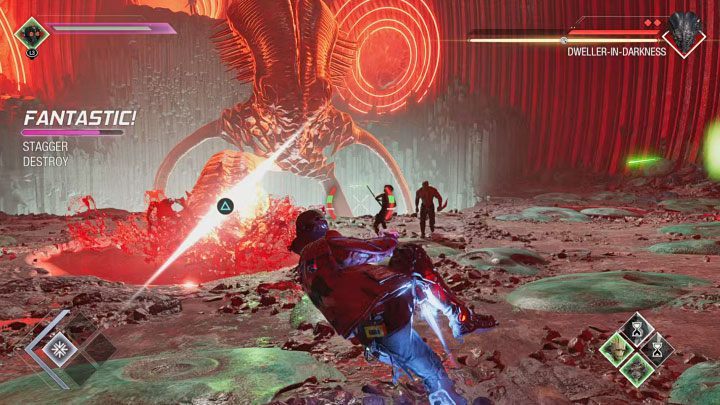 On this page of the guide to Marvel's Guardians of the Galaxy you'll find a walkthrough of mission 4 (The Monster Queen), which separately describes the options of selling either Rocket (breaking into the vault) or Groot (a stealth mission after dinner). The page also contains a description of the boss fight against the Dweller in Darkness.