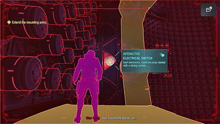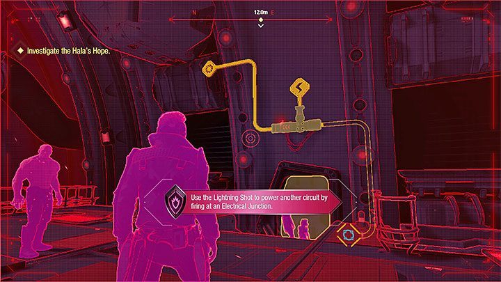 In this new area find the switches shown on picture 1. You can shoot them with lightning, manipulating the electric current. Use the vizor to constantly see where the power flows.