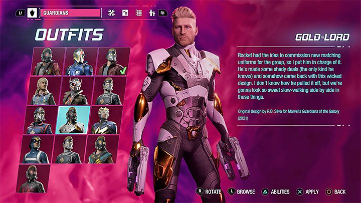 On this page of Marvel's Guardians of the Galaxy game guide, you will find a list of available outfits for Star-Lord (Peter Quill). We show you what Star-Lord's outfits/skins look like and also how you can get them.