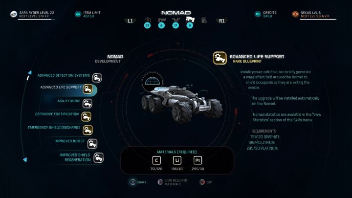 Aside from the Research and Development options to create new armors and weapons, Mass Effect Andromeda allows the player to upgrade the NOMAD. Despite the fact that you can easily skip this part, as you can move around the planets without investing in any upgrades, some of them are extremely valuable and can significantly increase the overall experience.