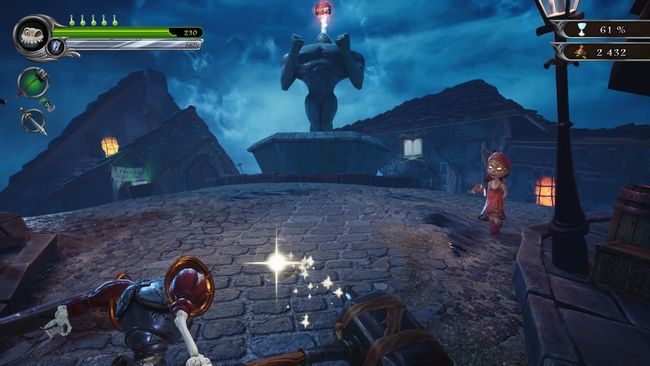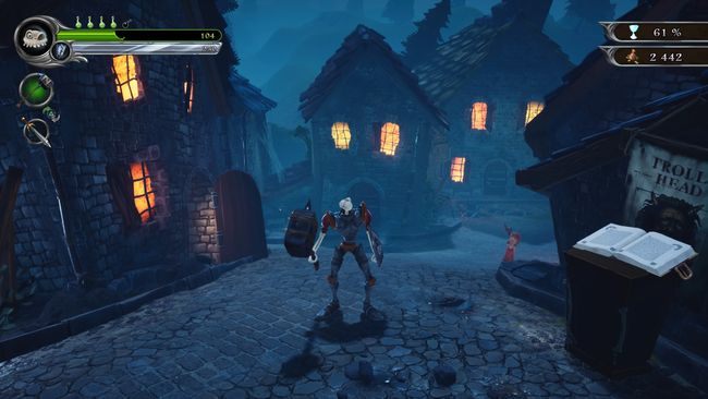 Don't attack the villagers even though they are attacking you - you will lose percentages for the Chalice. The Gargoyle will mention this at the beginning of the level. You can stun them with a charge (R1) - this won't hurt them. Stick to the left side. You should find an entrance to the church. Inside it, there is a book and a health fountain. You can also kill a rat in order to unlock an entry in the book of Gallowmere (charge the hammer with the circle button and hit the animal). Leave the church and you will see a forge in front of you. Inside, you will find another book, some gold, and a Silver Shield. On this level, you can use the hammer to break all barrels. In some of them you will find gold. On the right from the forge there is a small lake. Carefully walk around it and you will find a chest and a health vial. Just watch out so that you don't drown! Return to the crossroad near the church and the forge. Go forward until you reach the fountain. On the top of the fountain, you should see the Chaos Rune. Next to it, there is a book. Go to the left, then to the right. You should reach the docks. Use the wall to go down along the water. Use the lever and go collect the rune.