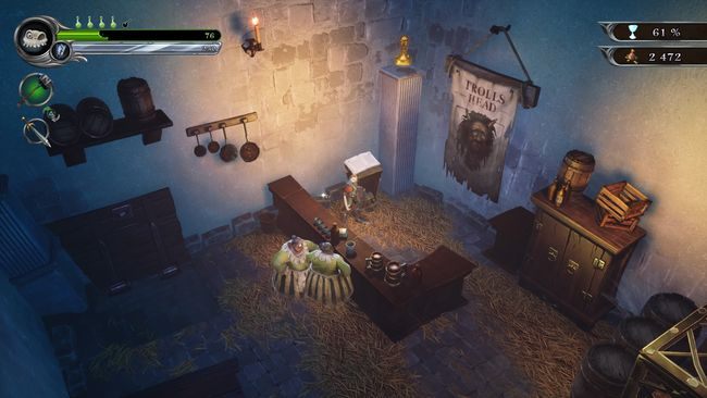 Go to the left, to another house. The door will open automatically when you get close. This time don't destroy the barrel but leave it be - it will be needed for putting some weight on the pressure plate. Use the Rune and watch out for the woman. Jump into the basement and destroy all the barrels. Collect the club from the chest. Go right and upstairs. Watch out for the cook and the butcher. Quickly read the book and destroy the barrels. Behind them, you will find an Earth Rune. Go back down and use the rune. Switch the lever and return up. Collect the Landlord's bust.