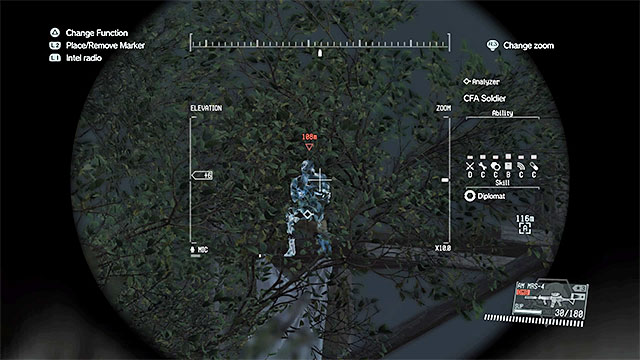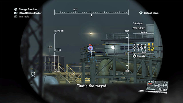 Description: It is best to reach Mfinda Oilfield from the east. After reaching your destination, silently eliminate the guard watching the entrance and avoid the gunship flying over the area. The biggest problem in this mission are enemy snipers. They are located on the metal balconies in the central part of the oilfield (you can see one of the on the picture above). You can send D-Dog towards them and order it to kill or knock them out. You can also reach them by yourself and deal with the enemies. If you chose the second option, remember to crawl and use the buildings, containers and other large objects for cover.