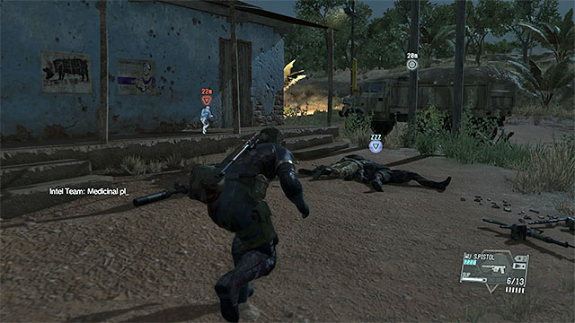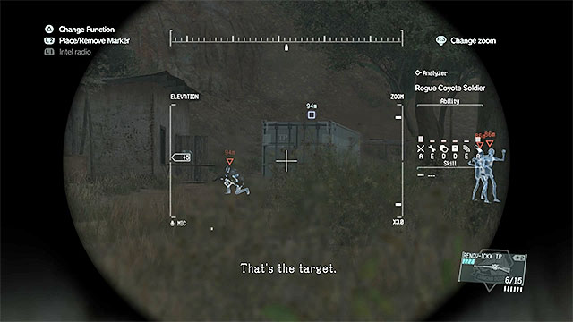 Description: It is best to approach Ditadi Abandoned Village from the north-west. You don't have to eliminate all the enemies in the village, but only those connected to the mission. D-Dog will help you identify your targets. Start from dealing with the snipers. If you have a good rifle, you can eliminate the soldier on the watchtower from distance, or you can first deal with all the other soldiers and then climb the tower and defeat him in melee fight. In the last part of the mission, sneak up to the APCs to Fulton them and attack the gunship. The machine is very durable, so use the best rocket launcher that you can and hide behind the buildings or rocks when reloading. Also, before you attack the gunship, you should go away from the village.