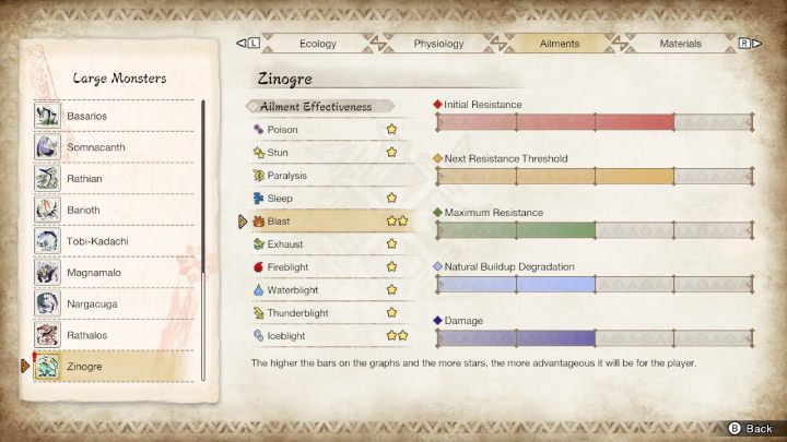 The above image lists all the parts of the monster's body and their susceptibility to particular weapon types and elements. The higher the number, the more damage is dealt.