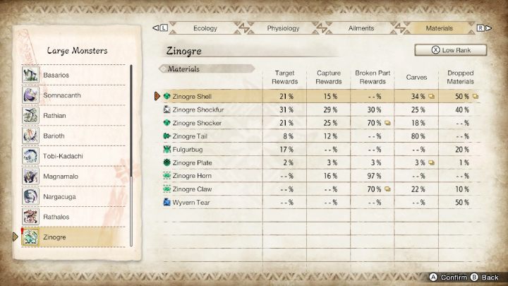 Above you will find a list of all the usual and rare items that you can get by fighting this monster. Some of them are necessary to make particular weapons or armor.