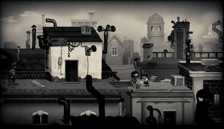 Now the game will test your reflexes. Move the crate to the right to the upper roof. Then jump quickly on the roof (you have to do it one at a time, first with one and then with the other hero). Take control of the girl, take the boy's hand and sprint. Jump over the gap, press the button, take control of the boy and grab the girl by the hand. In the meantime you can switch to the girl, and use sprint.