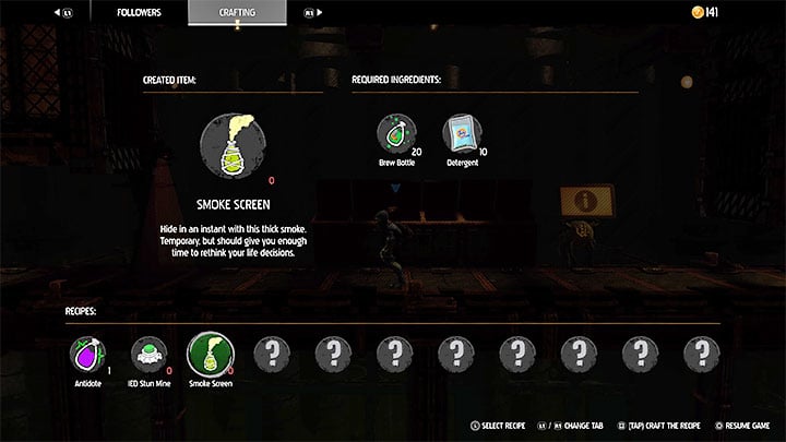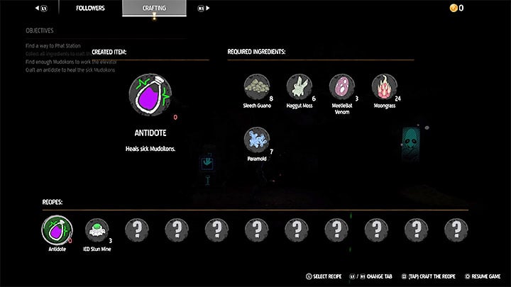 - Crafting is necessary to progress in certain levels in the game. The first such situation occurs in level 4 (the Funicular), where we need to collect 5 specific ingredients to craft an antidote and progress the game's main storyline.