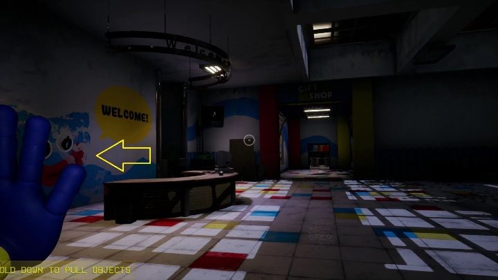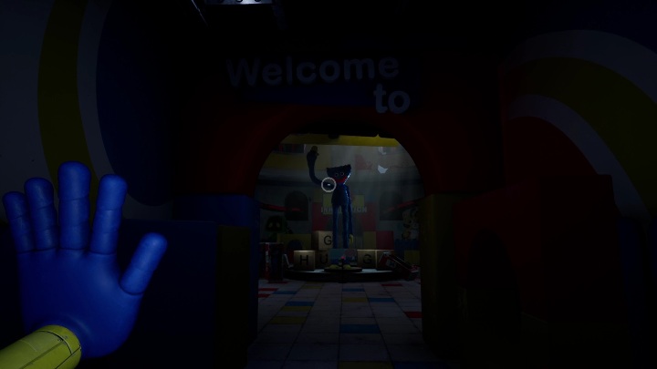 In the middle of the hall, you will see the main monster for the first time in this chapter. Huggy is just standing in the middle of the room, he won't do anything to you, even if you hit him or throw things at him.