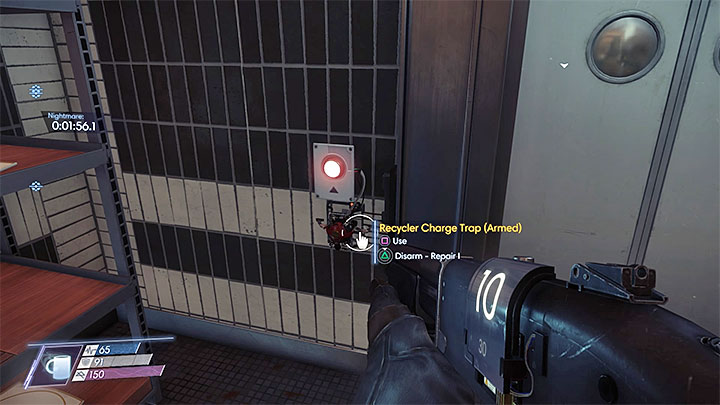Head towards the kitchen's exit, but remember - haste makes waste. Mitchell left a trap shown above - an active recycler charge. You can disarm it if you have the Repair I skill, or simply shoot it. In the latter case, maintain safe distance, or you'll die.
