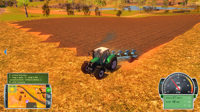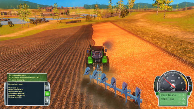 The plow's shape makes it impossible to plow the field into even rows To a larger, or smaller extent, there are V-shaped unplowed strips of land. What is important, is that you bring the plow down still before you roll onto the field - that is when you plow it for 100%. The bottom end is that you plow some of the area outside of the field's boundaries. The season to plow is the early Spring, so that harvest can take place in late Summer. In the case of sowing Winter grains, you need to plow in late Summer (you can harvest then in early Summer). You can drive freely all around the plowed field, as long as your plow is up.
