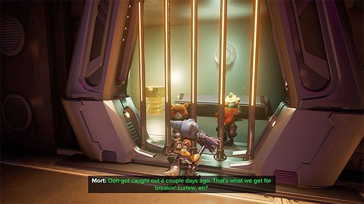 The gold bolt is also located in the west wing of the prison. It's inside one of the cells to the north on the upper level, specifically the one that contains a group of Morts. Initially, you won't have access to the collectible, because the vertical barriers prevent you from entering the cell even with Phantom Dash.