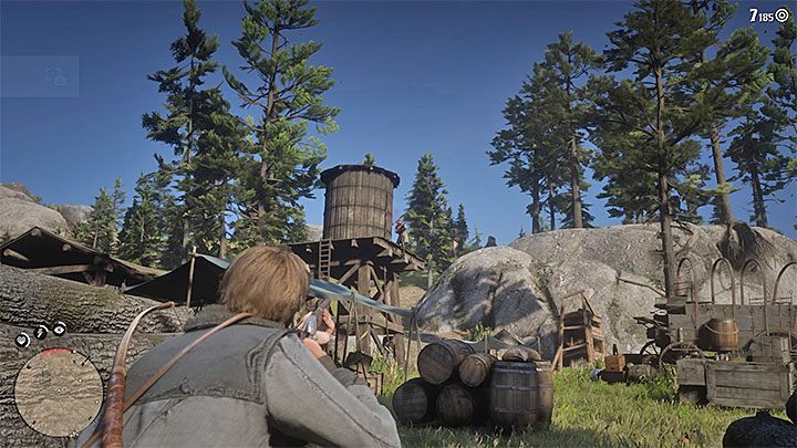 Gradually move towards the main bounty hunter camp where Sean is imprisoned. At first, take care of clearing the camp of enemies and then again hide behind any cover. Sean is hung on a line attached to a tree. It's best to liberate him by shooting at the rope, but you can also approach it and cut it as an alternative. As a reward for completing the mission, you will receive a tomahawk that you can throw.